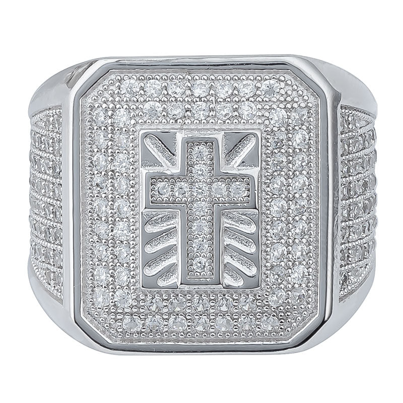Make a powerful statement of style and faith with the MR181W ring, crafted in solid 925 sterling silver and finished with a premium rhodium plating for a lasting, high-shine polish. The bold rectangular face showcases a finely etched cross motif surrounded by dazzling pavé-set cubic zirconia (CZ) stones, offering exceptional brilliance and presence. A structured band with side detailing adds strength and sophistication to this timeless piece.