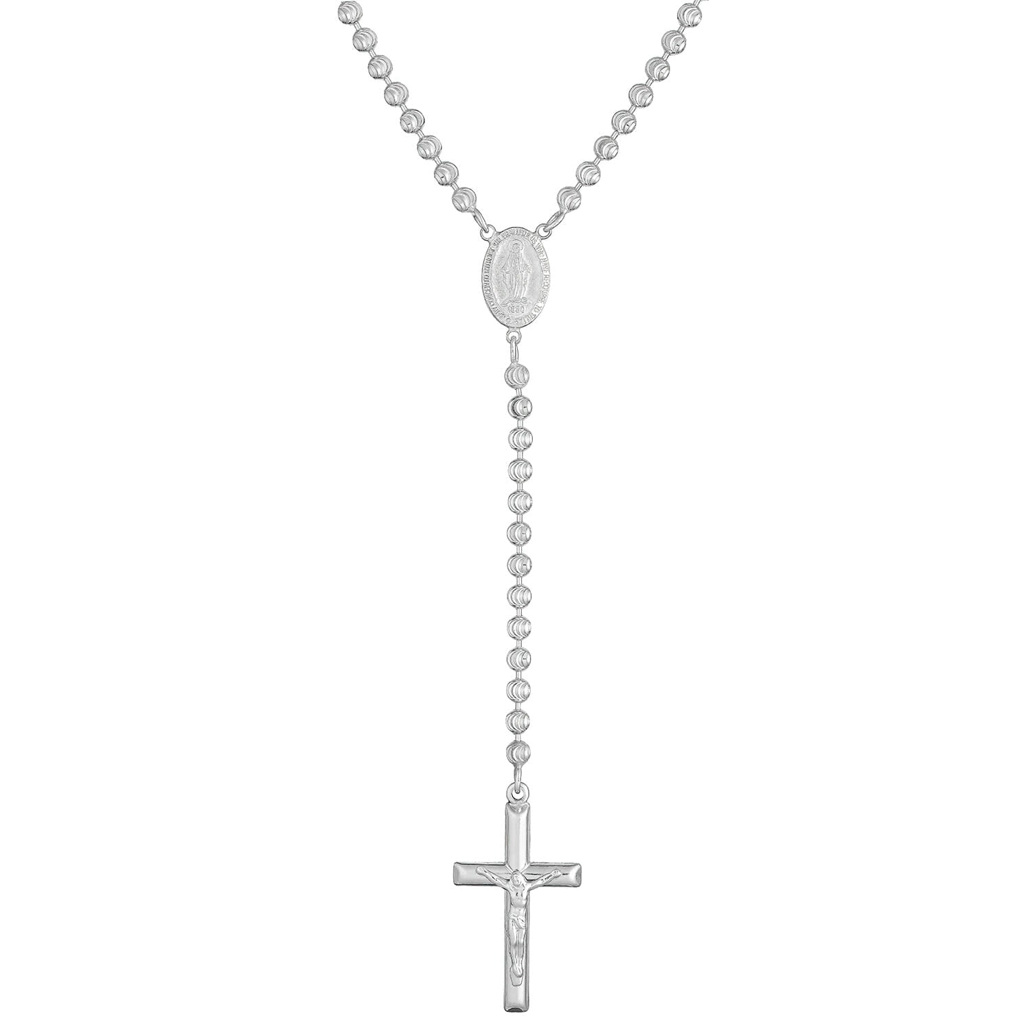 ROS100 – Rhodium Plated Sterling Silver 4mm Diamond-Cut Rosary Necklace with Crucifix